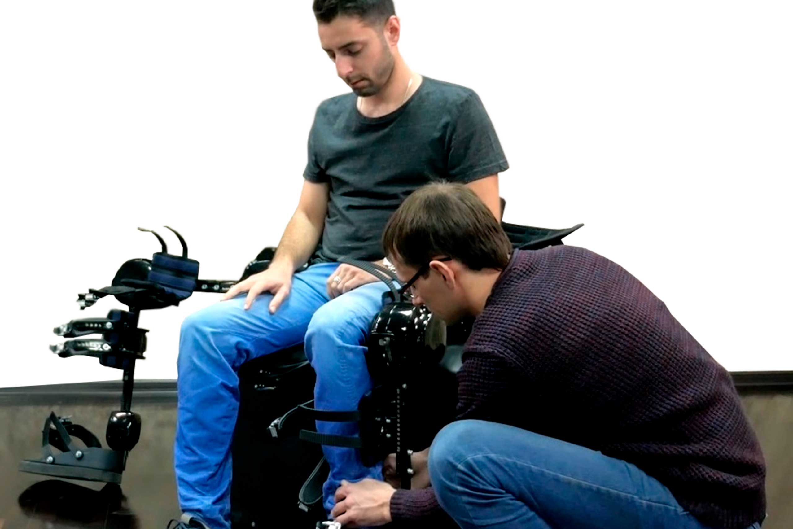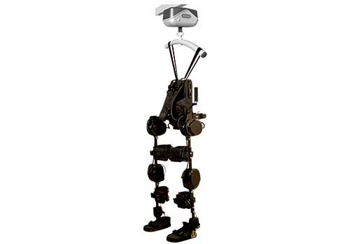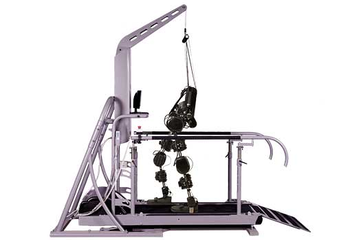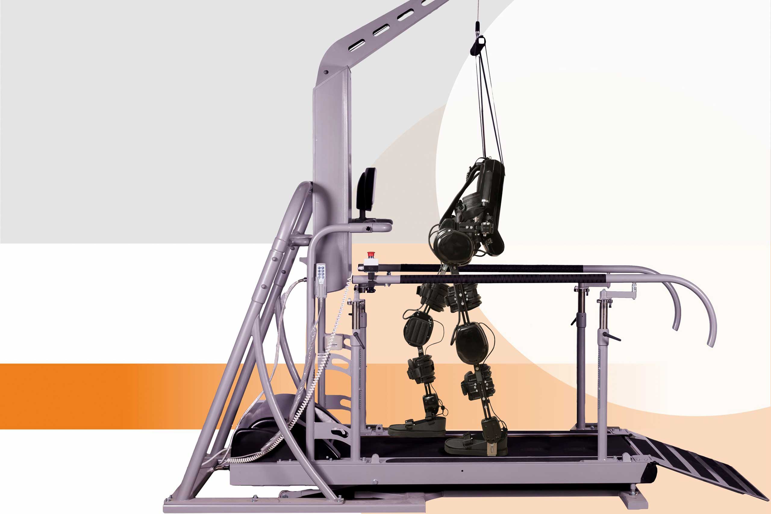 The treadmill, using infrared sensors, automatically adjusts to the speed of movement of the exoskeleton.